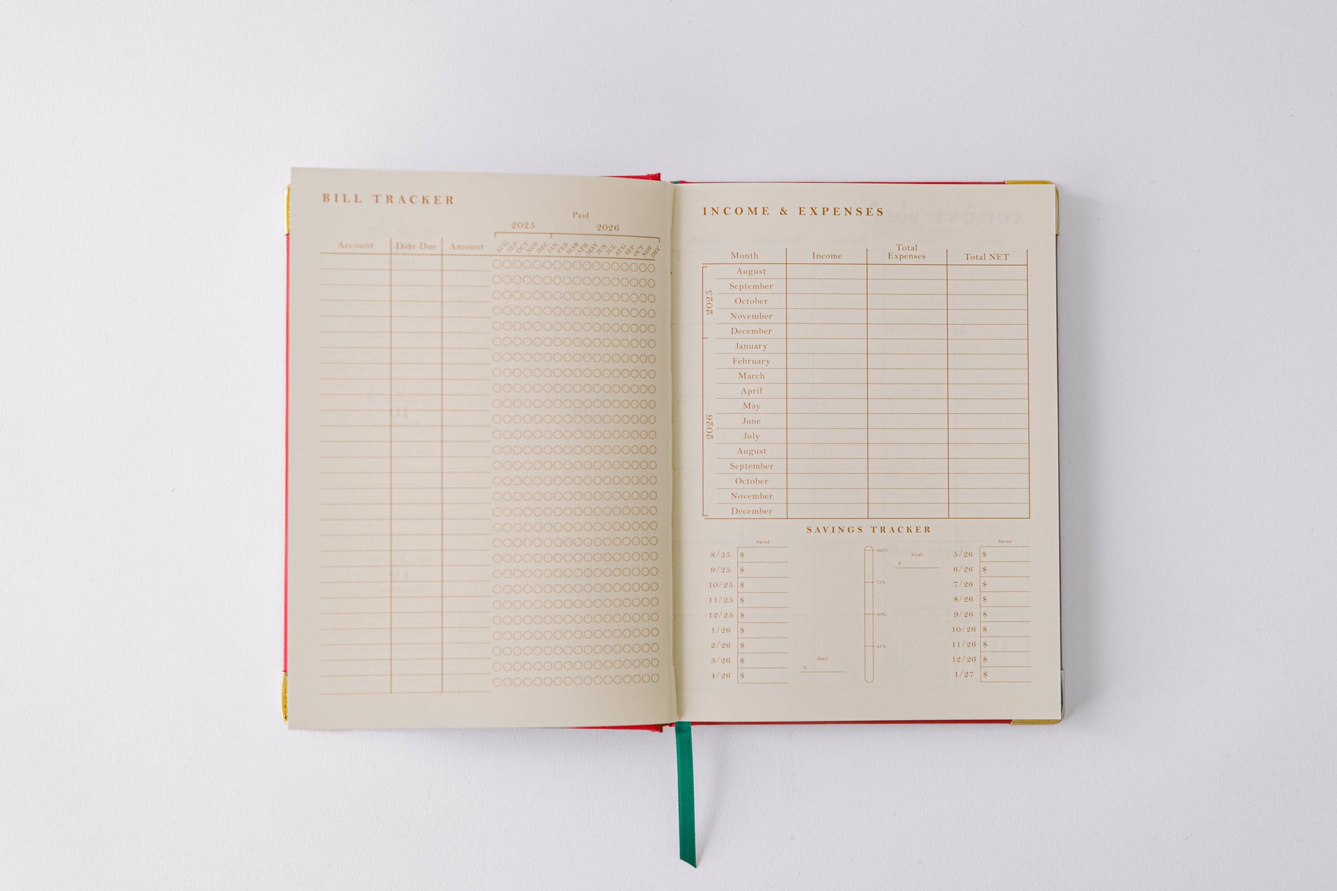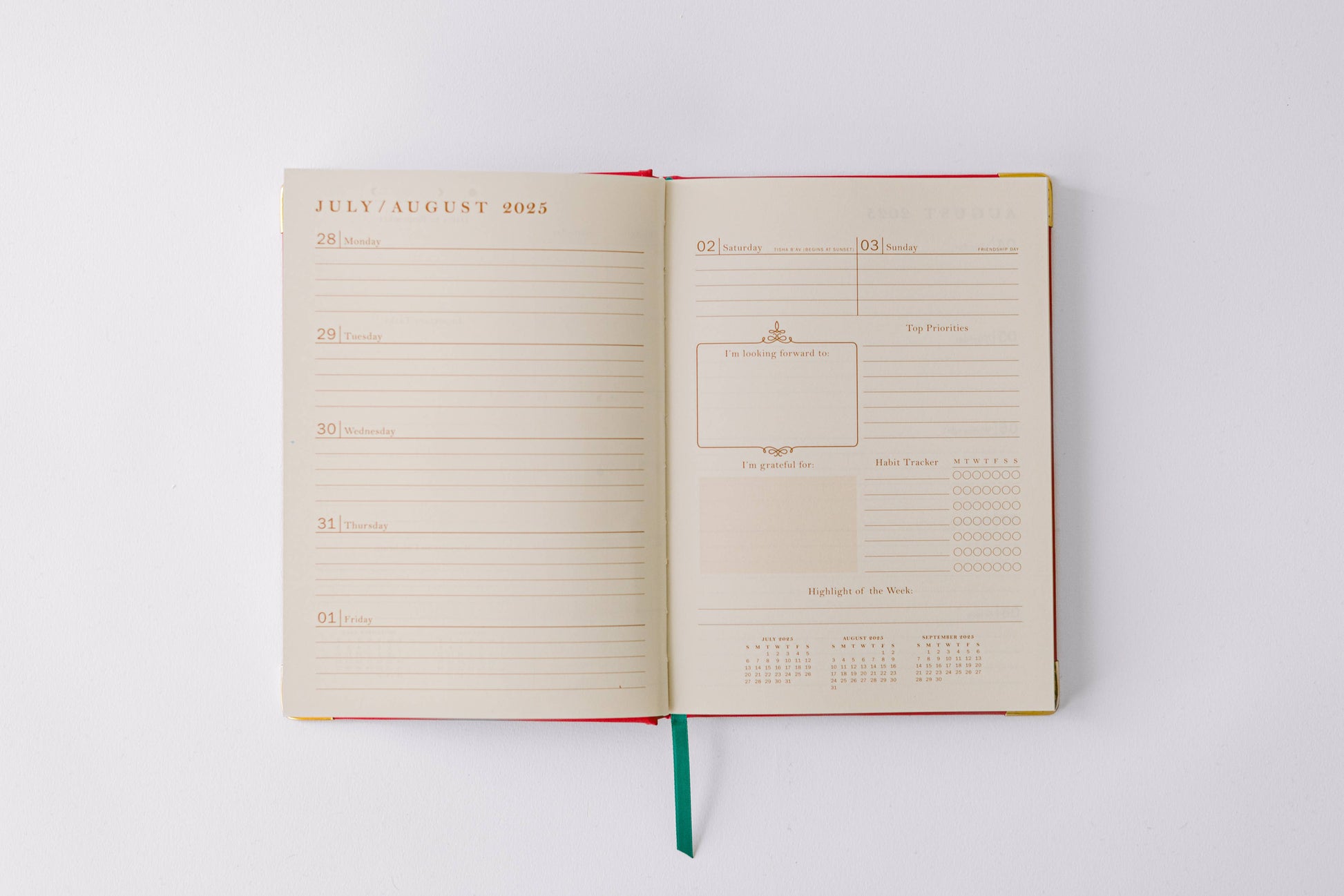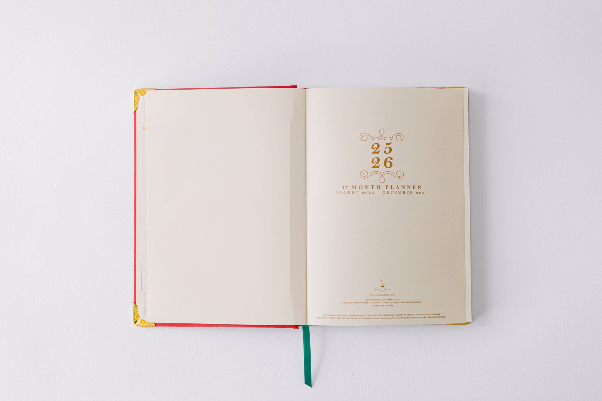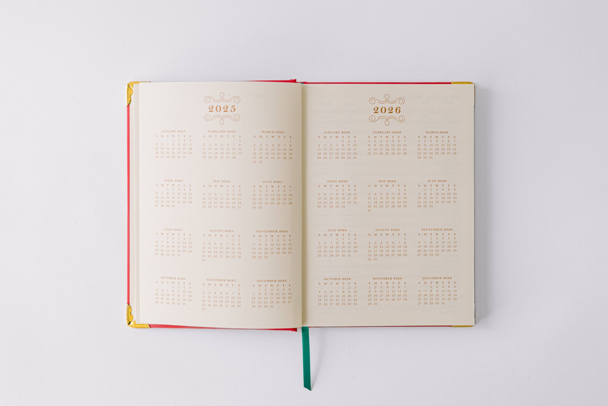 Details: Hardcover planner measures 6.25" x 8.5", Two year calendar and holiday overview , Several informational and contact pages , Foil-stamped sticker sheet tucked in interior pocket , Ribbon marker