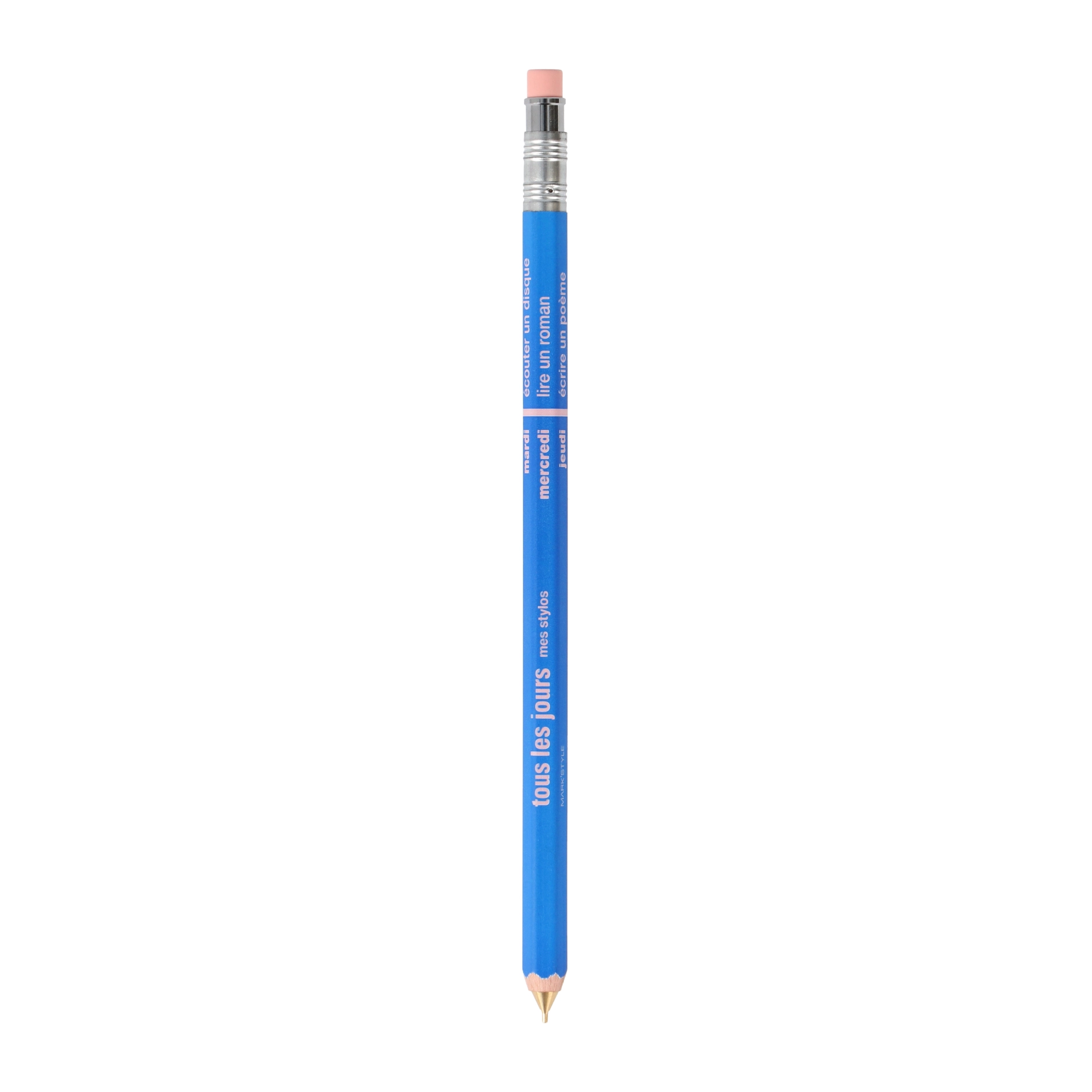 This precise mechanical pencil is perfect for sketching, drawing, and detailed notes. Its wooden barrel charmingly features the days of the week in French—"tous les jours"—alongside delightful daily pastimes like reading a book, traveling, and watching movies.