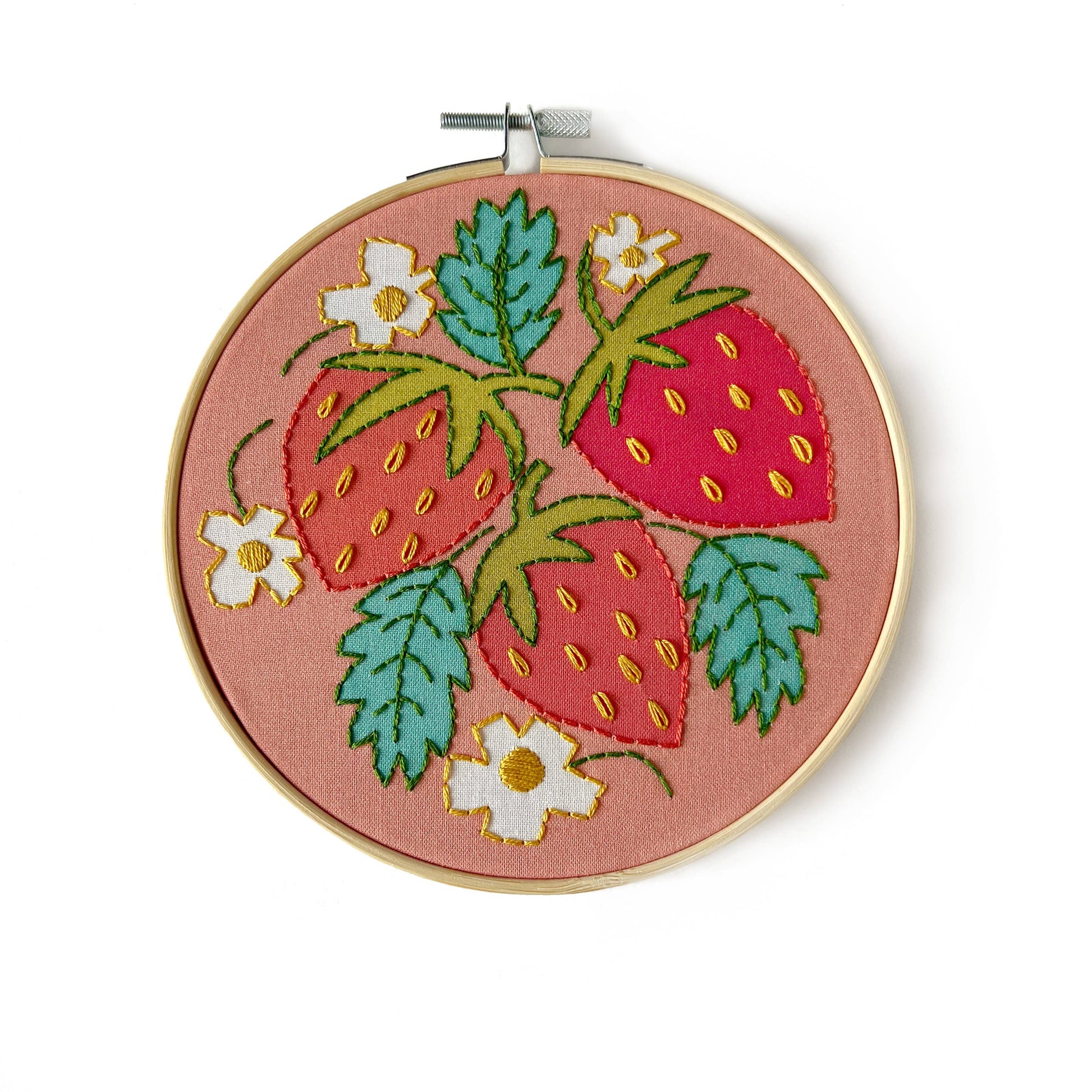 Stitch up a sweet springtime treasure with this delightful Strawberries Embroidery Kit! Picture fresh, juicy strawberries blooming against a pretty pink background in your finished 6" hoop. This kit includes everything you need to get stitching—pre-printed fabric, needle, floss, and access to tons of embroidery tips on rikrack.com. Whether you're just starting out or already a seasoned stitcher, this design welcomes all skill levels. A berry good choice for your next project!