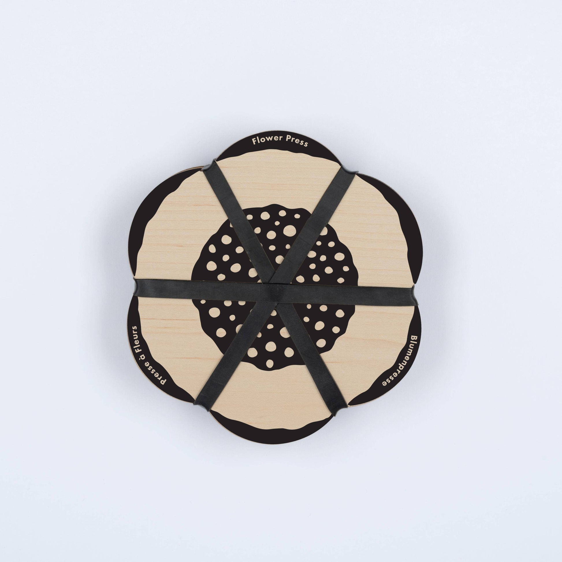 Details Size - 15cm diameter x 3 cm Materials - 6mm Maple veneered sustainably sourced board - Card and paper circles - Silicone Rubber bands to avoid loss of elasticity Packaging - Info card fastened to back of each press with product image and ‘how to use’ information.